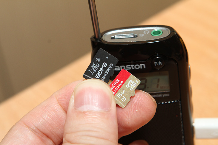 MicroSD를 넣어서 MP3를 재생해보기로 합니다. MicroSD가 64GB / 16GB 두가지를 가지고 있었는데요. 이 제품은 32GB까지 사용이 가능합니다. 이유는 FAT32로 포멧된 것만 사용이 가능해서 입니다. 64GB 메모리를 장착하면 FAT32로 포멧하여 32GB까지만 사용이 가능합니다. 즉 여기에 넣겠다고 32GB를 초과하는 너무 큰 용량의 메모리를 꽂는것은 의미가 없다는 이야기죠.