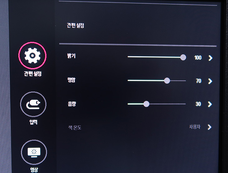 설정으로 들어가면 더 많은 모니터 설정이 가능 합니다. 간편설정에서는 밝기, 명암, 음량, 색온도 등을 조정할 수 있습니다.