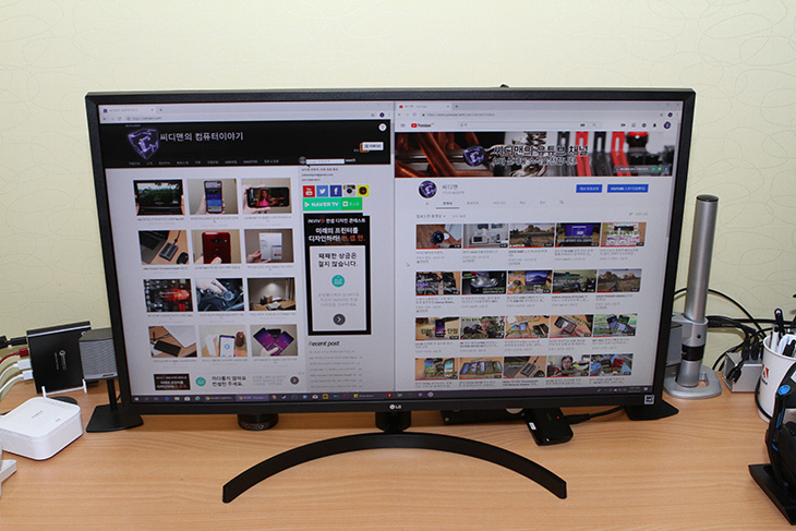4K UHD 해상도에서 150%로 배율을 조정한 상태에서 제 블로그와 유튜브 화면을 나란히 열어봤습니다. 충분히 위아래 사이즈도 넓고 해상도도 넓어서 충분히 넓게 보입니다. 화면도 크고 해상도도 넓은 형태로 모니터의 최대의 효율을 사용할 수 있습니다.