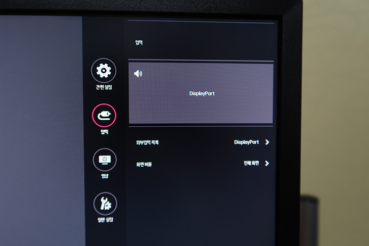 입력에서는 모니터 입력 변경이 가능합니다. 근데 이 단계 까지 들어오지 않고 그전 단계에서 바로 쉽게 조정이 가능합니다. 선택할때마다 HDMI 1 , HDMI 2 , DP 가 순차로 변경이 됩니다.