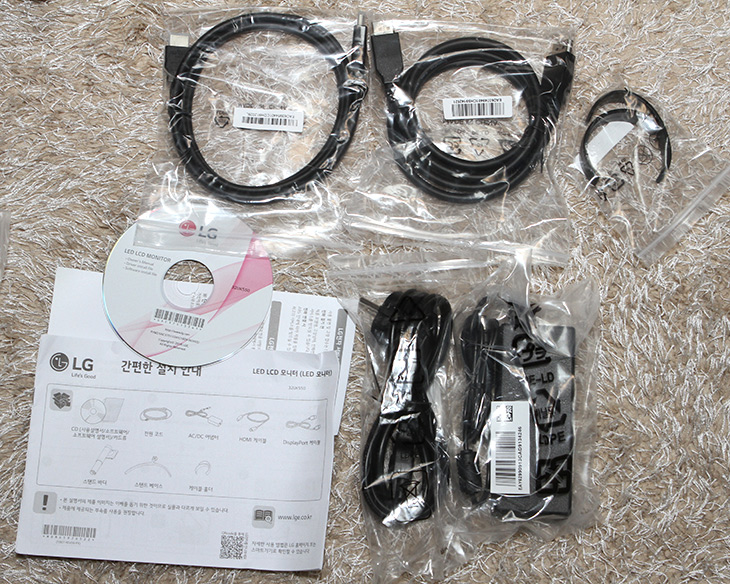 모니터 부속품을 살펴 봤습니다. 케이블과 전원어댑터 , CD 등이 보입니다.