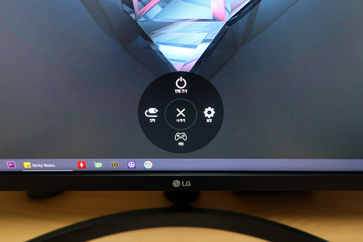 모니터의 설정을 통하면 더 많은 기능을 이용할 수 있습니다. 모니터 하단에 버튼을 누르면 메뉴가 나타납니다. 4방향으로 버튼을 밀어서 전원끄기, 입력, 설정, 게임 설정이 가능 합니다.