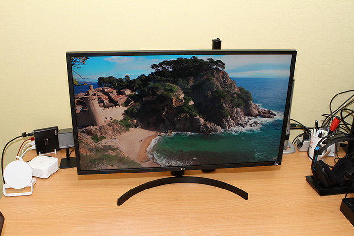모니터는 32인치 사이즈 입니다. 32인치면 무척 커서 불편할 것이라고 생각하는 분들이 있는데 저 역시 27인치와 32인치 이렇게 쓰면서 결국 32인치로 넘어왔지만 32인지가 개인적으로는 가장 적당한 화면사이즈 같습니다. 27인치도 커서 더 큰 화면은 불편해서 못쓸것 같다고 하는 분들도 제가 32인치를 권했을 때 그것을 적응하는데 하루도 안걸리더군요. 큰 화면을 쓰다가 작은 화면을 쓰면 무척 불편합니다. 이 화면은 빛반사가 없는 안티글레어 타입 입니다.
