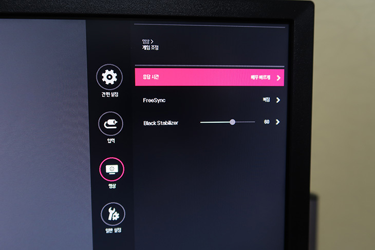 설정 세부 메뉴에서도 게임 설정이 가능 합니다. 이 모니터는 144Hz를 지원하는 LG 게이밍모니터 시리즈는 아니므로 일부 설정은 존재하진 않습니다. 하지만 이 모니터도 응답속도는 충분하여 4K 60Hz에 한해서 게임을 하는 것이 충분히 가능 합니다.