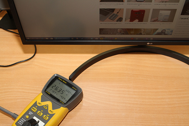 모니터를 사용 중 전력소모량을 측정해 봤습니다. 전력소모량이 26.35W 수준으로 측정 됩니다. 모니터 밝기는 53으로 설정을 해둔 상태 입니다. (제 방의 밝기에 맞게 모니터 밝기를 조정한 상태) 과거에는 4K 모니터에 32인치면 전력소모량이 매우 높았지만 최근 모니터는 전력소모량도 무척 낮은 편 입니다.
