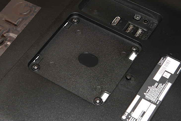 모니터와 모니터 받침대를 고정하는 부분 입니다. 볼트가 4개가 보이는데 이것을 풀면 VESA를 지원하는 모니터 암에 연결이 가능합니다. 볼트가 미리 채결이 되어있어서 볼트를 특별히 찾거나 그럴 필요 없는점이 괜찮네요. 모니터 암이 있는 분은 쓰셔도 되고 안쓸수도 있습니다.