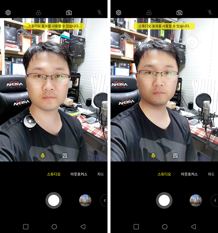 전면카메라로 촬영시에는 ToF 센서를 이용해서 거리를 측정하여 좀 더 정확하게 아웃포커싱이 가능한데요. 근데 또 특별한 기능으로 스튜디오를 이용하여 조명을 원하는곳에 둘 수 있었습니다. 스마트폰에서 사진 촬영 후 얼마든지 후보정으로 보정이 가능하겠지만 복잡하고 시간이 걸린다면 잘 쓰지 않게 됩니다. 스튜디오 기능은 원하는 곳에 조명을 놓고 바로 사용이 가능합니다. 조명을 꼭 옆에 실제로 둔 것 처럼 촬영이 가능하다는 것이죠.