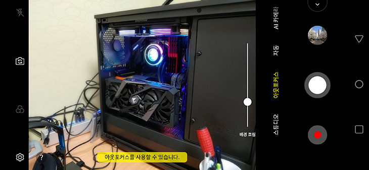 아웃포커스 촬영의 경우 후면카메라는 사진/동영상이 가능하며, 전면카메라의 경우 사진 촬영이 가능 합니다. 후면의 경우 동영상 촬영이 가능해서 특정사물만 효과를 준 상태에서 주변을 조금 흐리게 처리가 가능했습니다. 물론 Dslr 카메라를 이용한 아웃포커스와 비교하면 효과를 사진에 적용시키는 정도라 좀 차이가 있긴 하지만 동영상 촬영시에도 이용할 수 있으니 주변을 모자이크 처리하거나 흐리게 나오게 해야할 때 자주 사용할 수 있을 것 같았습니다. 동영상 촬영시 초상권 문제로 일일이 모자이크 처리하기 힘들때 쓰면 좋을듯 했습니다.