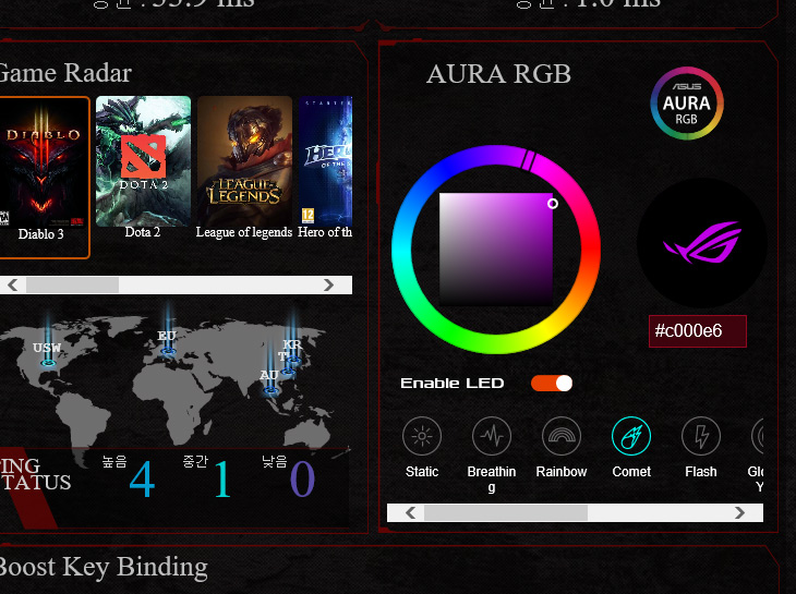 네트워크 상태나 PING 상태 , 게임 최적화를 위한 핑의 상태, AURA RGB 등을 설정할 수 있습니다.