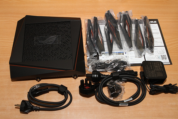 박스를 열어봤는데 사각형의 모양의 라우터가 보입니다. ROG RAPTURE는 상당히 감각적인 디자인을 하고 있는데요. 정사각형 모양이 아니라 사각형에 주변에 삼각형 모양이 붙어 있는 특이한 디자인을 하고 있습니다. 상단에는 ROG 마크와 함께 ASUS 만의 특이한 무늬가 들어가 있습니다.