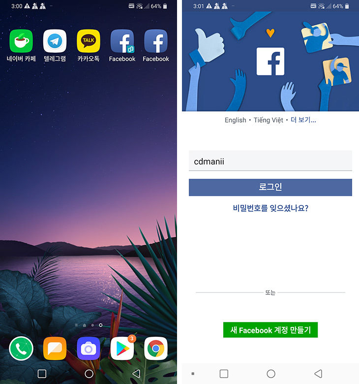 한가지 좀 아쉬웠다면 네이버카페 처럼 아이디로 로그인 해야 하는 이 앱은 듀얼 앱에서 인식이 안되네요. 네이버카페도 아이디를 다르게 해서 로그인이 가능한데 이것이 안되는게 좀 아쉬웠습니다. 추후에 업데이트로 이것도 가능하면 좋겠네요.