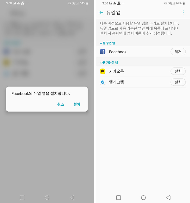 듀얼 앱을 이용할 수 있습니다. 이것은 스마트폰을 회사에서도 개인적으로도 사용시 필요한 기능인데요. 메신저를 사용시 자신의 아이디로 메신저를 이용한다고 하면, 회사일을 마치고 집에 있어도 메신저를 보면 계속 일을 하는 느낌이 들 수 도 있습니다. 그런 이유로 회사에서 어쩔 수 없이 메신저를 사용해야 하는 경우 회사이메일로 계정을 새로 만들거나 해서 자신의 계정과는 독립시키는 경우가 많은데요. 그럴 때 필요한게 메신저가 그냥 2개 로그인이 될 수 없을까 하는 부분이죠. 페이스북을 회사용, 개인용 이렇게 2개를 동시에 로그인을 하는 것 말이죠.