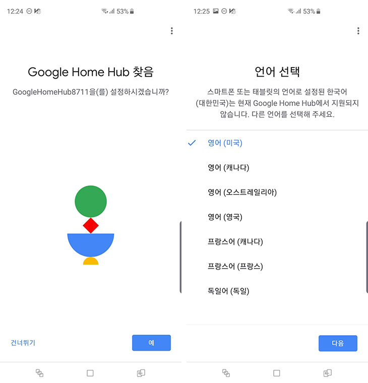 구글홈허브가 찾아졌다고 나오면 선택 후 설정을 합니다. 언어 선택에서 아직은 한국어가 없고 영어, 프랑스어, 독일어 정도가 지원 됩니다. 영어를 일단 선택 합니다.