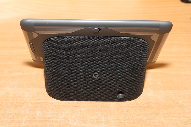 제품 후면에서 보면 태블릿에 꼭 받침대가 붙어 있는 듯한 디자인을 하고 있습니다. 후면에는 음성인식을 막는 스위치와 측면에 볼륨조절기가 있습니다. 후면에 전원단자가 보이는데 이부분에 전원선을 연결해야 합니다.