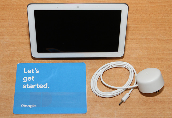 구성품으로는 구글 홈 허브와 전원어댑터, 설명서로 구성되어 있습니다.