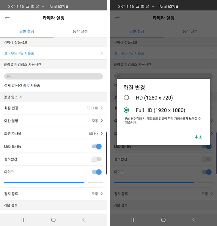 카메라 설정에서 화질 변경도 가능 합니다. HD 품질도 우수하지만 Full HD로 변경하면 좀 더 좋은 화질을 볼 수 있습니다. 설명에서는 네트워크 환경에 따라 느려질 수 있다고 되어있지만 정말 느린 WiFi를 쓰는게 아니라면 Full HD로 놓는것이 좋을듯 합니다. 어차피 클라우드 저장소를 쓰는 비용은 동일하니까요.