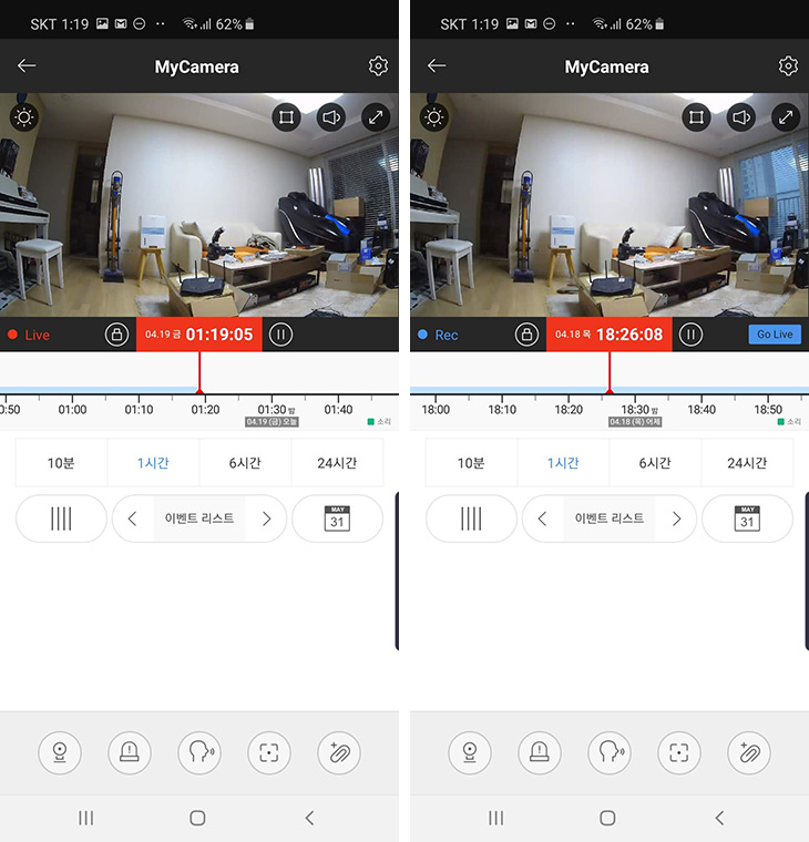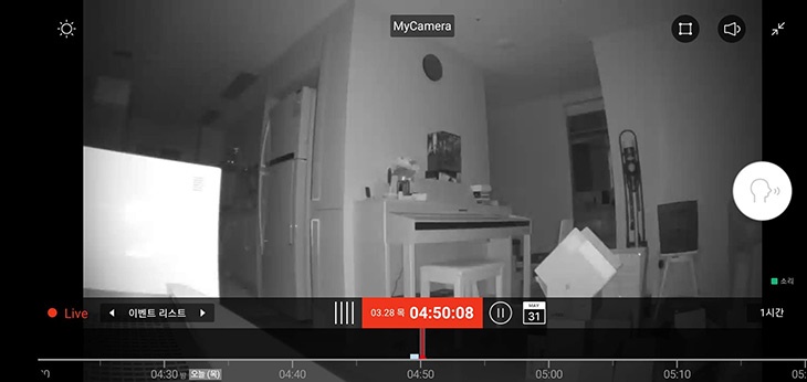 화면을 가로 화면으로 보면 더 넓게 볼 수 있습니다. 빛이 충분한 상태에서는 정말 화면이 선명하게 잘 보입니다. 아래에 타임라인도 너무 보기 편하게 되어있습니다. 시간별로 타임라인을 볼 수 있고 핑거줌 아웃을 하면서 더 빠르게 이전시간것을 볼 수 도 있습니다.