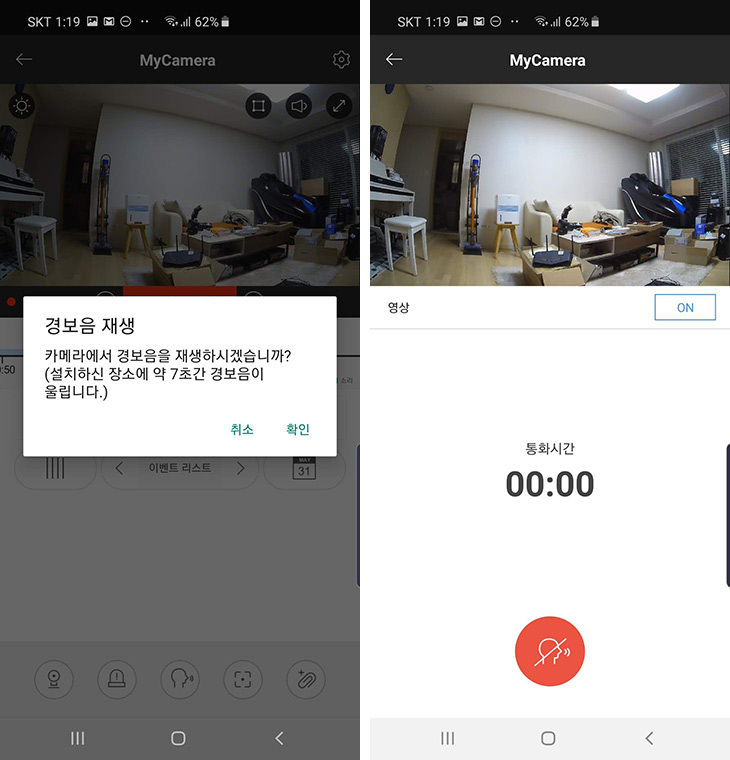 아래에 버튼을 이용해서 경보음 재생이나 양방향 통화도 가능합니다. 경보음은 집에 도둑이 들었을 때 경보음으로 알려주거나 또는 화재가 일어났을 때 경보음을 이용할 수 있겠죠. 양방향 통화는 토스트캠을 통해서 아이들과 이야기를 하거나 할 때 이용할 수 있습니다.
