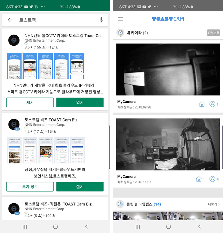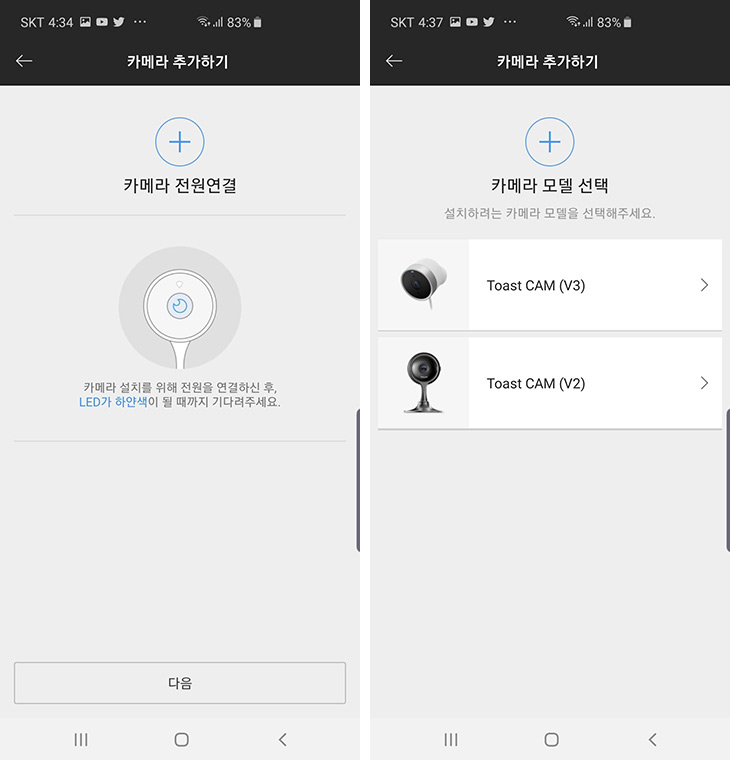 사용을 위해서는 스마트폰에서 토스트캠 어플을 설치해야 합니다. Play스토어에서 앱을 검색 후 설치 합니다. 저는 이미 사용중인 토스트캠 V2가 2개나 있어서 목록에 보이는데요. 처음에는 카메라 추가 + 버튼이 바로 보입니다.
