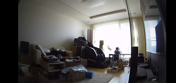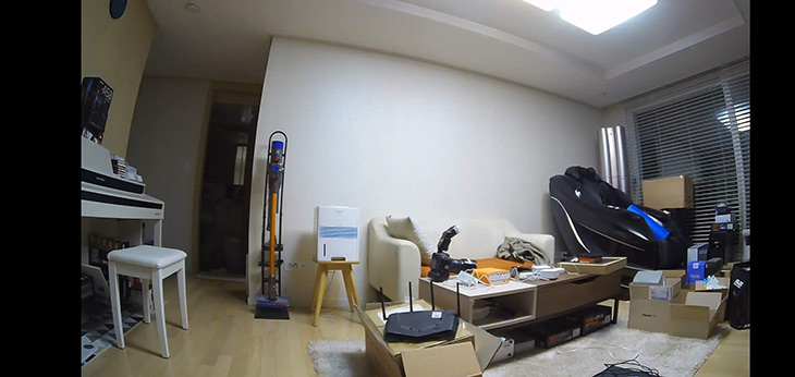빛이 좀 들어오고 밝아지는 상황에서도 어두운 곳과 밝은 곳 모두 다 꽤 잘 촬영이 됩니다. 화각도 꽤 넓어서 모서리 부분에 설치해두면 거의 모든 구간을 감시할 수 있습니다. 좌우로 돌려보면서 볼 필요가 없죠.