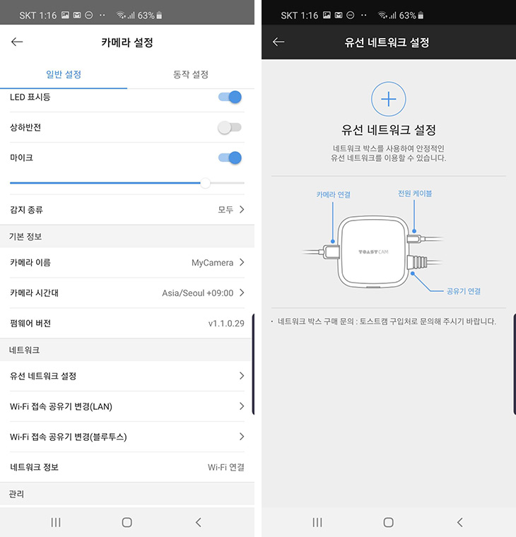 저는 유선으로 연결할 필요가 없었고, 비교적 먼거리에도 유무선공유기 성능이 좋아서 WiFi 신호가 닿아서 굳이 유선랜선을 쓸 필요는 없었습니다. 전원어댑터를 연결하면 바로 사용할 수 있는 준비가 됩니다. 토스트캠을 처음 설치하는 분들은 설치 방법이 어렵지 않을까 걱정할 수 있는데요. 저는 여러번 설치해봐서 더 쉽기도 했지만, 쉬울 수 밖에 없는것이 한국어로 안내멘트가 토스트캠에서 흘러나옵니다. "연결 준비가 완료 되었습니다." 등등 한국어로 말이 나오므로 정말 편합니다. 가끔 WiFi 신호가 끊기거나 제품연결에 문제가 있거나할때 상태를 램프 빛 만으로는 알수 없어서 답답할 때가 있는데 이 제품은 말이 나오니 너무 편했습니다.