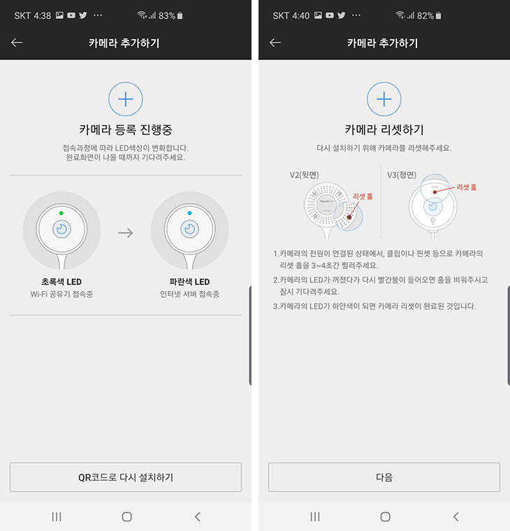 카메라 등록 과정이 이뤄집니다. 만약 중고로 구매를 하셨거나 또는 이전에 다른 유무선공유기에 연결되어 사용중인 상태로 등록하는 경우에는 등록이 잘 안될 수 도 있습니다. 그때는 제품 앞에 보면 상단에 리셋 홈이 있습니다. 그것을 길게 눌러서 리셋 후 다시 처음부터 진행하면 잘 됩니다.