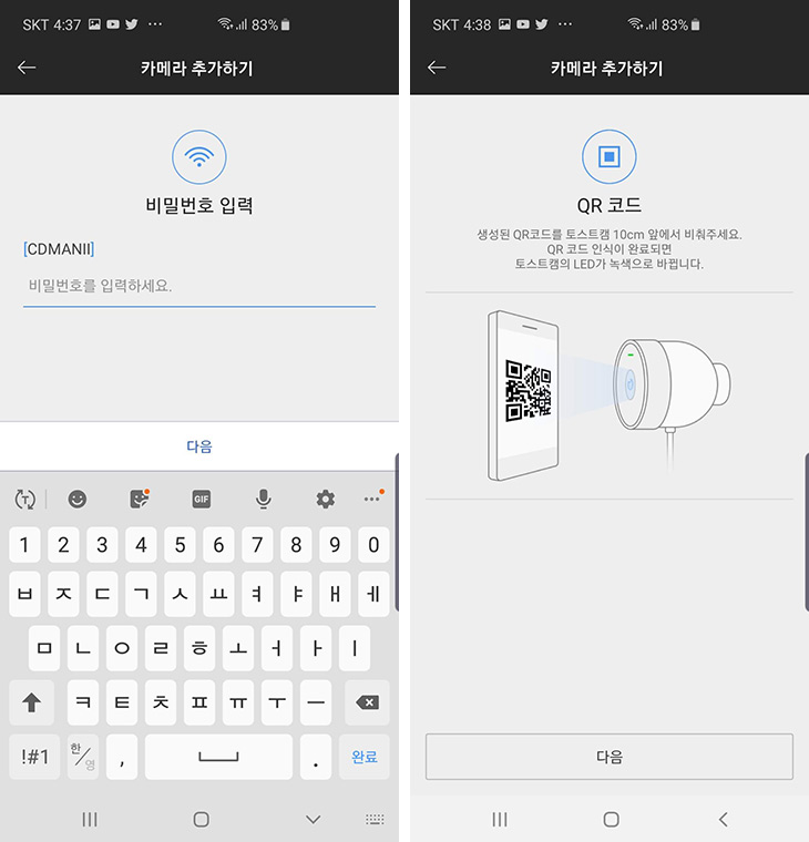 선택한 SSID에 대한 암호를 입력 합니다. 이렇게 하면 바로 연결이 진행 됩니다. 만약 연결이 잘 안되는 경우에는 QR코드를 인식시켜서 연결을 완료 할 수 도 있습니다.