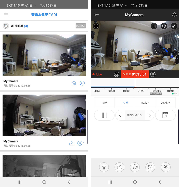 토스트캠의 감시화면은 실시간으로 감시가 가능하며 필요하다면 이전 기록도 돌려가면서 볼 수 있습니다. 그리고 토스트캠 화면에 동시에 100명이 접속해서 본다고 하더라도 느려지거나 하는 문제가 없습니다. 일반적인 CCTV 경우에는 데이터가 MicroSD에 기록될 경우 동시에 여러명이 볼 수 없습니다. 느려지는 문제가 있어서이죠.