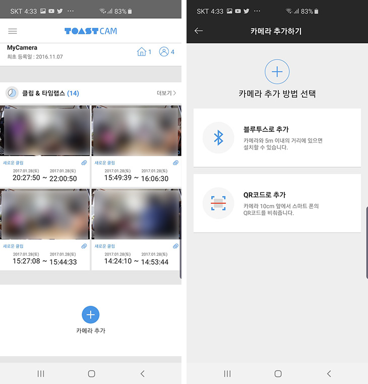 아래에 있는 카메라 추가 버튼을 누릅니다. 카메라 추가 방법은 블루투스로 추가하는 방법과 QR코드로 추가하는 방법이 있습니다. 블루투스로 연결을 선택 합니다. 이렇게 하면 스마트폰에 블루투스가 켜져 있는 경우 토스트캠을 블루투스로 연결 후 WiFi 로 연결을 바로 진행을 합니다. 다른 모델 경우 제품 하단에 코드를 넣거나 복잡한 과정이 필요하지만 그런 과정이 없는게 편합니다.