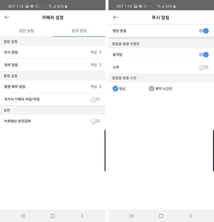 동작 설정에서는 푸시알림과 경비알림 등의 설정이 가능 합니다. 움직임이 감지 되었을 때 알림을 받을 수 있죠.