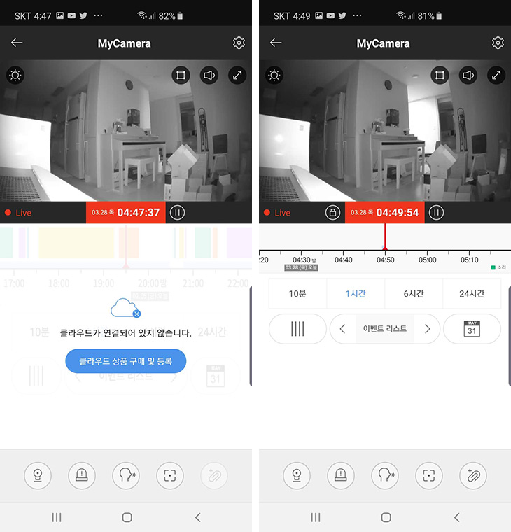 화면을 가로 화면으로 보면 더 넓게 볼 수 있습니다. 빛이 충분한 상태에서는 정말 화면이 선명하게 잘 보입니다. 아래에 타임라인도 너무 보기 편하게 되어있습니다. 시간별로 타임라인을 볼 수 있고 핑거줌 아웃을 하면서 더 빠르게 이전시간것을 볼 수 도 있습니다.
