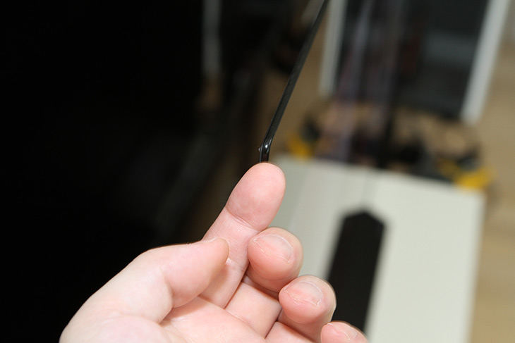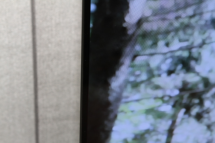 이렇게 얇은 두께가 가능한 건 아까 잠깐 언급한 것처럼 올레드(OLED) 패널이기 때문인데요. 올레드(OLED) 패널은 LCD TV와 달리 별도 백라이트가 필요 없기 때문에 압도적인 얇은 두께를 자랑합니다. 상단 화면 부분의 두께는 정말 얇아서 제 손가락이 엄청 굵어 보일 정도네요. 정말 손끝으로 잡아도 가려질 만큼 많이 얇습니다.
