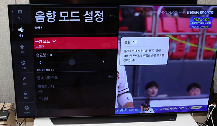 음향모드를 직접 수동으로 조작도 가능 합니다. 스포츠에서는 스포츠 모드를 켜서 더 현실감 넘치는 사운드를 들을 수 있는데요.