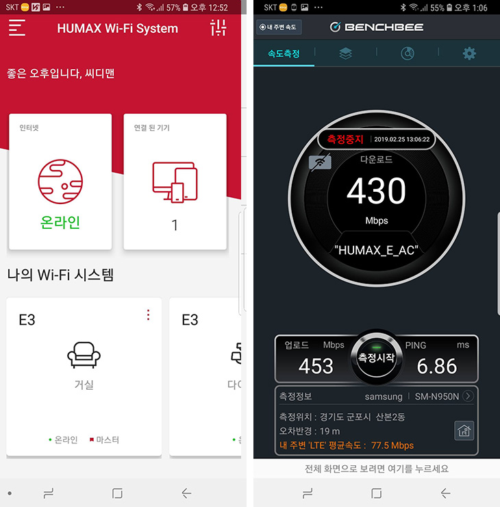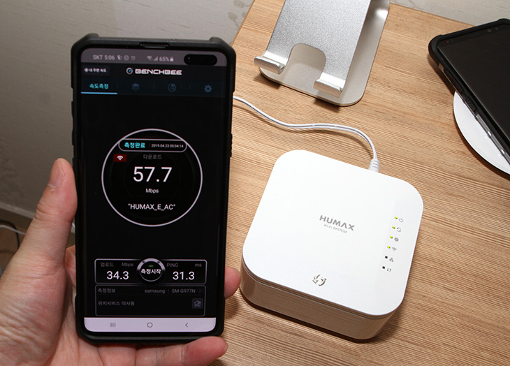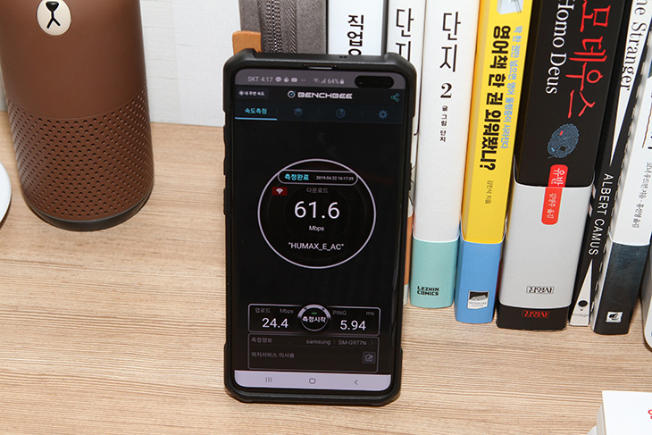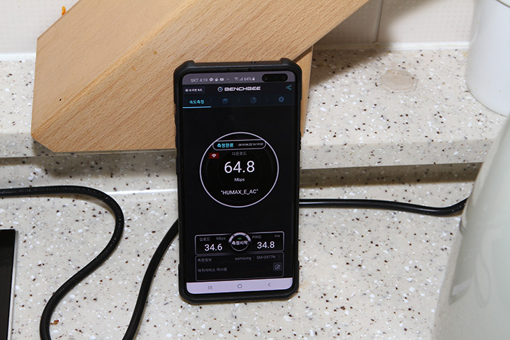 HUMAX E AC 에 연결한 상태에서 속도 테스트를 해 봤는데요. 스마트폰마다 성능이 다르긴 하겠지만 최신 스마트폰으로 테스트 해보니 430Mbps 정도의 속도가 나오네요. 성능은 꽤 괜찮게 나옵니다.