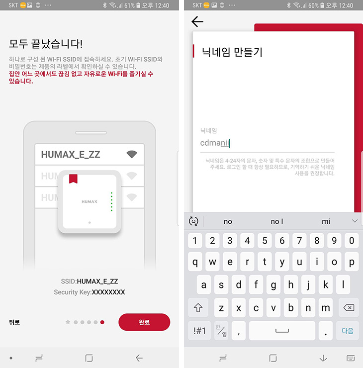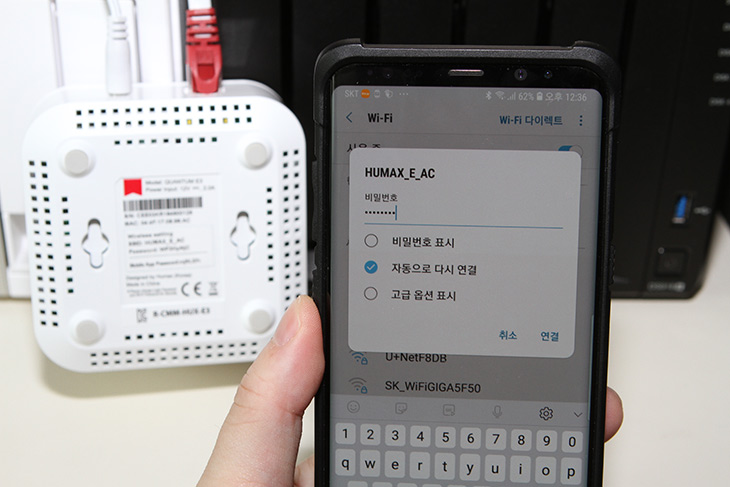 스마트폰에서는 SSID를 HUMAX_E_AC 를 선택해서 연결을 하고, 비밀번호는 E3 하단에 있는 SSID 비밀번호를 입력하여 연결을 합니다.