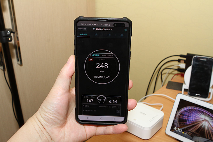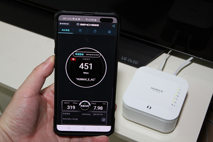 MASTER E3 앞에서 갤럭시S10 5G를 이용해서 속도 테스트를 해 봤습니다. 성능을 벤치비로 측정결과 다운로드 451Mbps , 업로드 319Mbps 의 성능이 나옵니다.