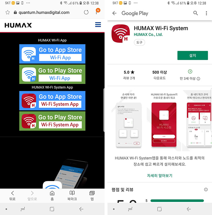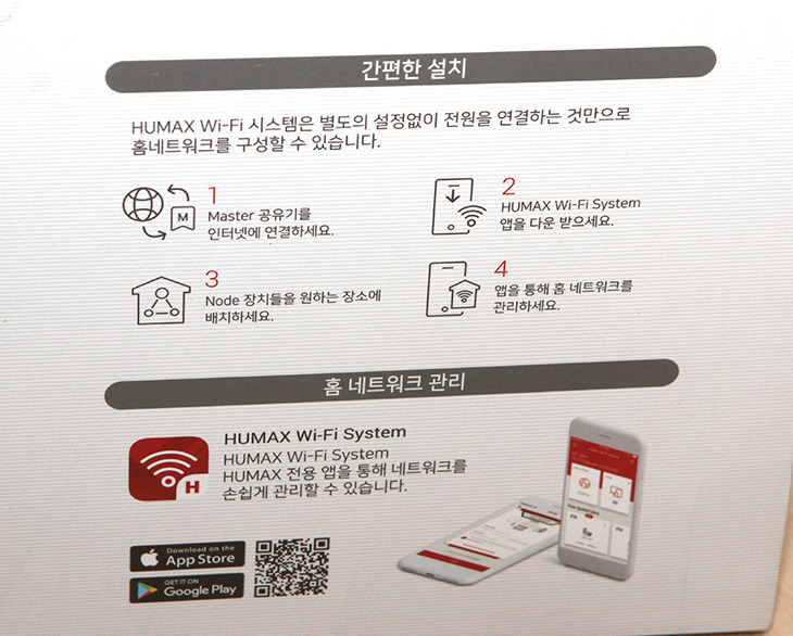 두번째로는 HUMAX WiFi System 앱을 설치를 합니다. QR코드를 이용해도 되고 "HUMAX WiFi System" 를 검색해서 설치해도 됩니다. 검색시 앱이 두가지가 나오는데 빨간색 아이콘의 앱을 설치하면 됩니다.