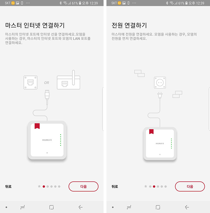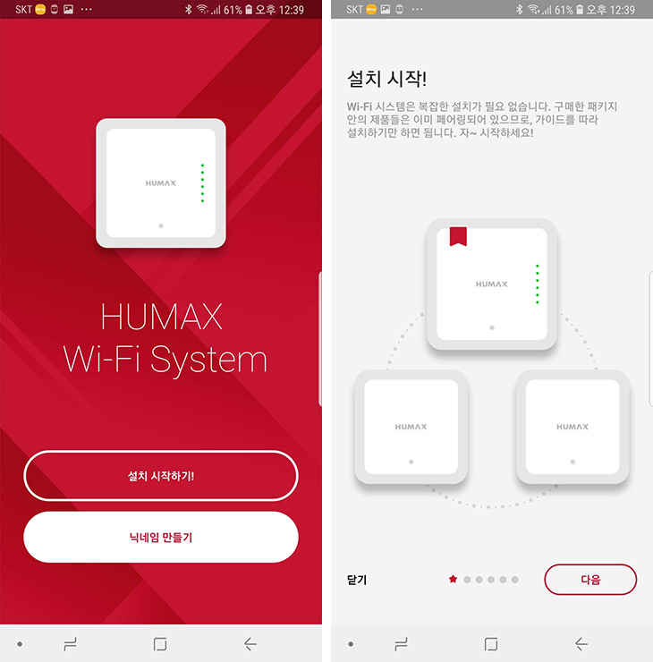 HUMAX WiFi System 앱을 설치를 진행을 합니다. 설치 시작하기를 선택 후 다음을 누릅니다.