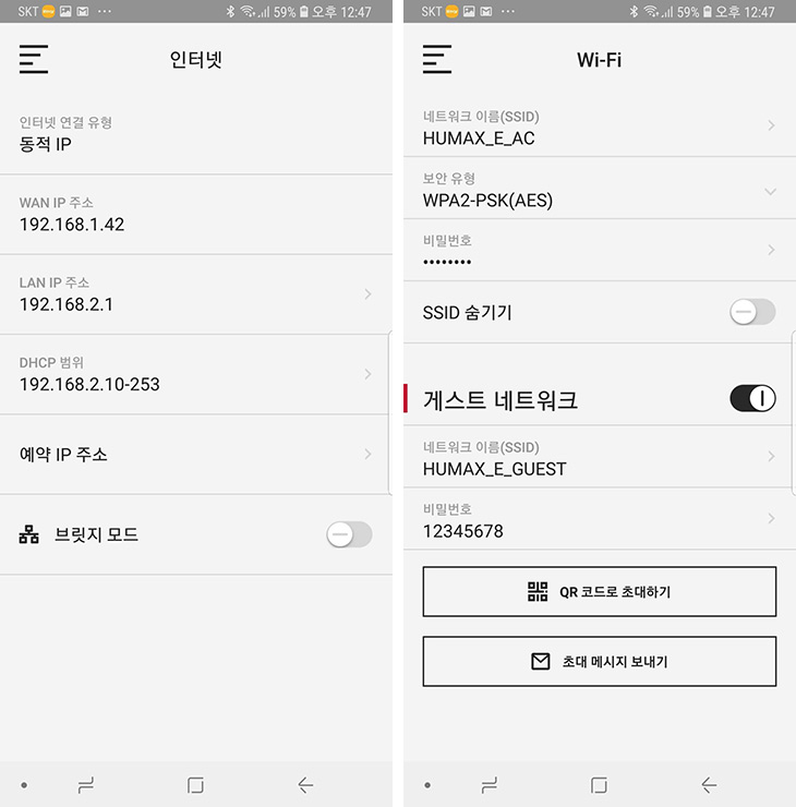 인터넷 설정에서 보면 WiFi가 어떻게 구성되어있는지 등의 설정을 볼 수 있습니다. WiFi에 들어가보면 비밀번호가 나옵니다. 비밀번호는 기본값을 사용하지 않고 사용자가 임의로 지정해서 사용하는것이 좋습니다. 게스트 네트워크 설정도 가능 합니다.
