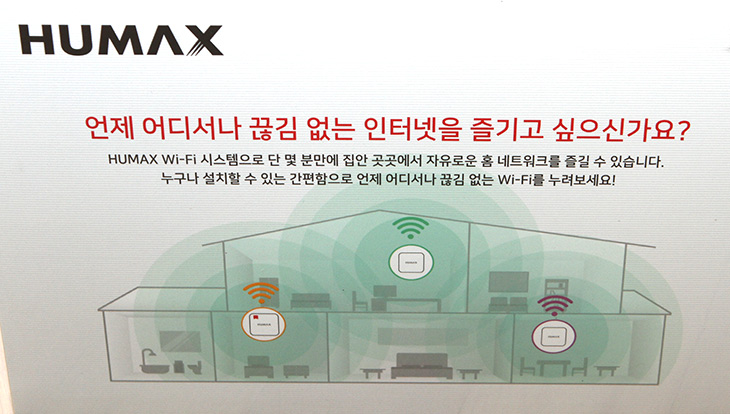 박스에 상세하게 설명이 있는데요. HUMAX E3는 와이파이 또는 유선을 이용해서 WiFi를 확장하는 시스템입니다. E3 3개를 이용하여 무선범위를 극도로 넓힐 수 있으며 WiFi 음영범위를 줄이고 더 넓은 공간에서 더 빠르게 WiFi를 사용할 수 있도록 합니다. 무선만을 이용해서 확장이 가능하며 이렇게 하면 랜선을 직접 연결하기 힘든 공간에서도 WiFi 영역을 넓힐 수 있습니다.