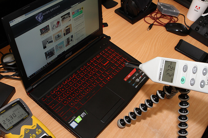 웹서핑시 소음을 측정해 봤습니다. 측정기는 Center-320입니다. 노트북 바로 앞에서 측정시 27.2dB이 나옵니다. 팬소음이 거의 없다시피 하는 상황이라 소음도 무척 낮게 나왔습니다. 참고로 26dB 정도면 정말 아무것도 없는 방에서의 소음정도 입니다.