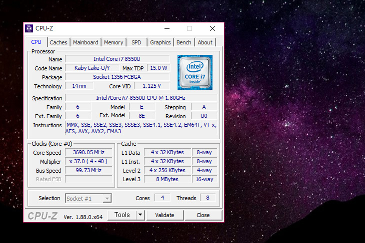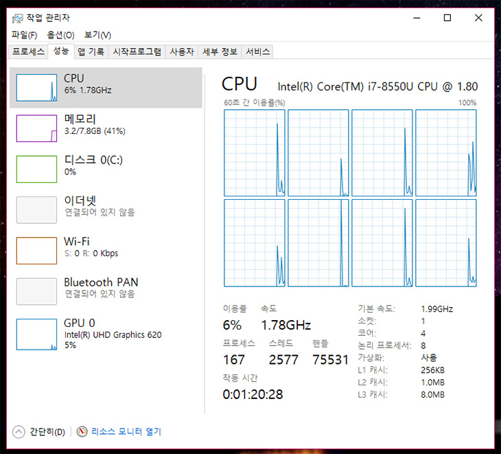 CPU는 i7-8550U가 사용되었습니다. 과거에는 U모델이 2코어 였지만 세대가 바뀌면서 이제는 4코어로 올라갔습니다. 4코어 8쓰레드로 동작하면서 저전력CPU이지만 성능이 나름 괜찮아졌죠. 다양한 작업을 동시에 수행하더라도 끊기지 않고 작업을 할 수 있습니다. 그러면서도 전력소모량이 낮다는 장점이 있죠.