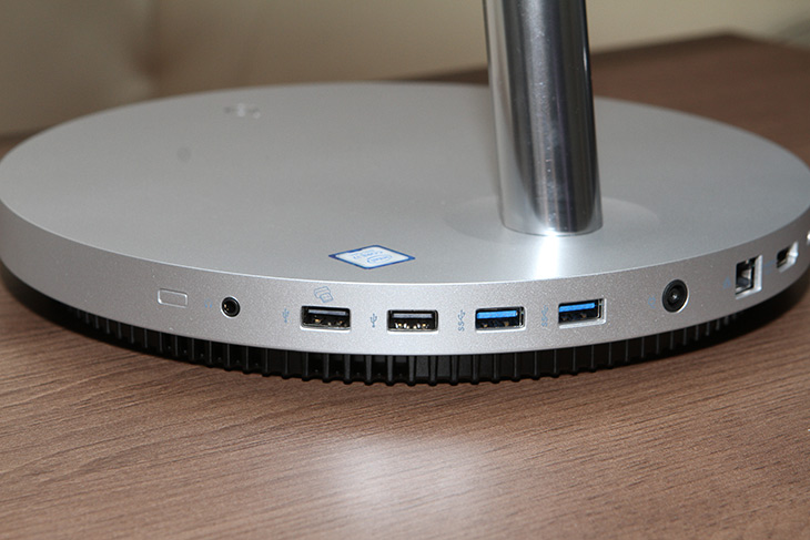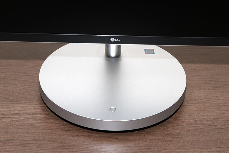 받침대 앞부분에는 전원 버튼이 있어서 쉽게 전원을 켜고 끌 수 있습니다. 전체적으로 디자인이 깔끔해지는 것이 일체형PC의 장점일 것 같네요.