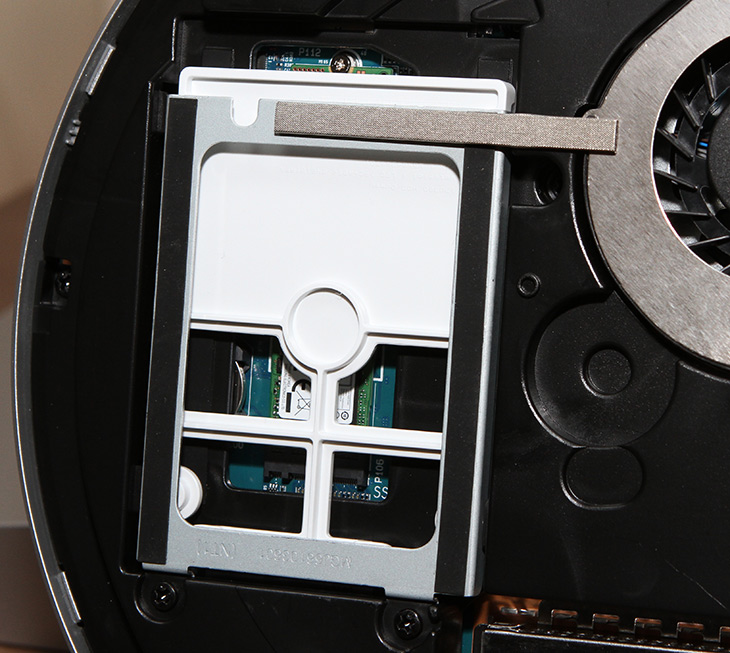 M.2 SSD가 장착된게 보입니다. 그 위로 S-ATA 2.5인치 타입의 저장소를 장착할 수 있는 부분이 보입니다. S-ATA, M.2 슬롯을 이용하여 필요하다면 저장소 용량을 넓힐 수 있습니다.
