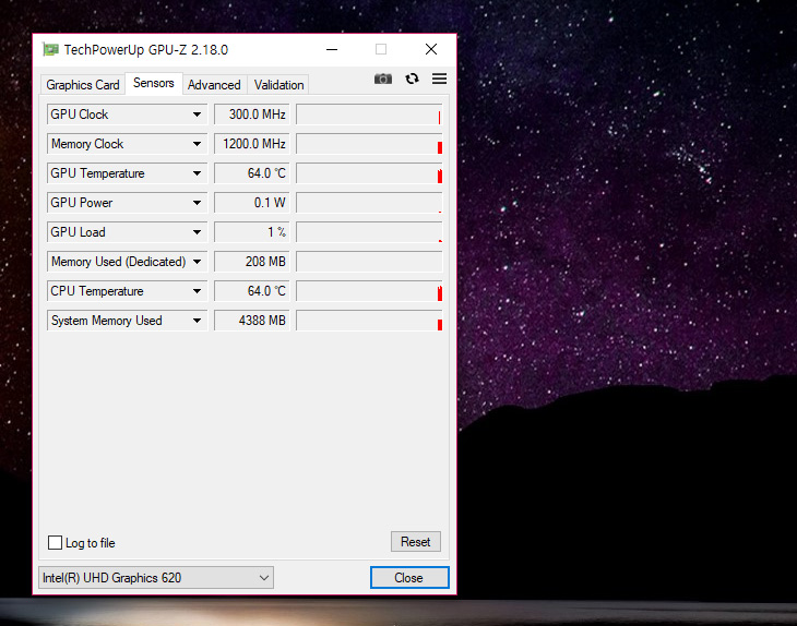 온도는 64도 정도가 측정되네요. 실제 사용시 내장그래픽은 발열이 낮게 유지하는데 도움을 주기도 합니다.