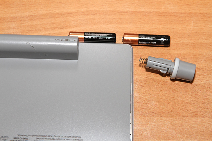 측면에 덮개를 열어 건전지함을 열어봅니다. AAA 타입 건전지를 넣어서 사용할 준비를 합니다.