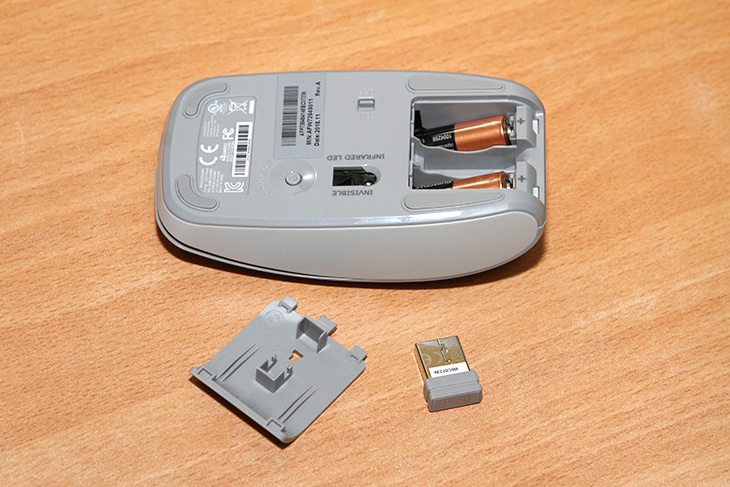 마우스 하단에 커버를 열어서 건전지함 내부를 봅니다.