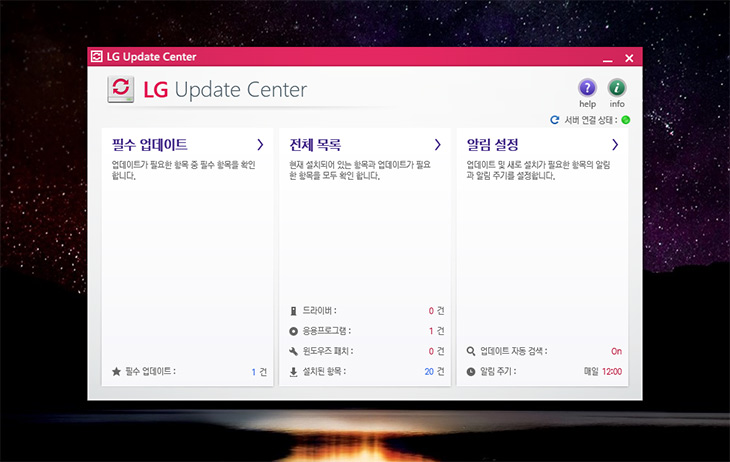 LG Update Center를 이용하면 쉽게 소프트웨어를 업그레이드 할 수 도 있습니다. 대기업PC의 장점이기도 하죠. 사용자가 번거롭게 드라이버를 찾아서 업그레이드 하지 않아도 알아서 이 프로그램이 장치의 드라이버를 관리를 합니다.