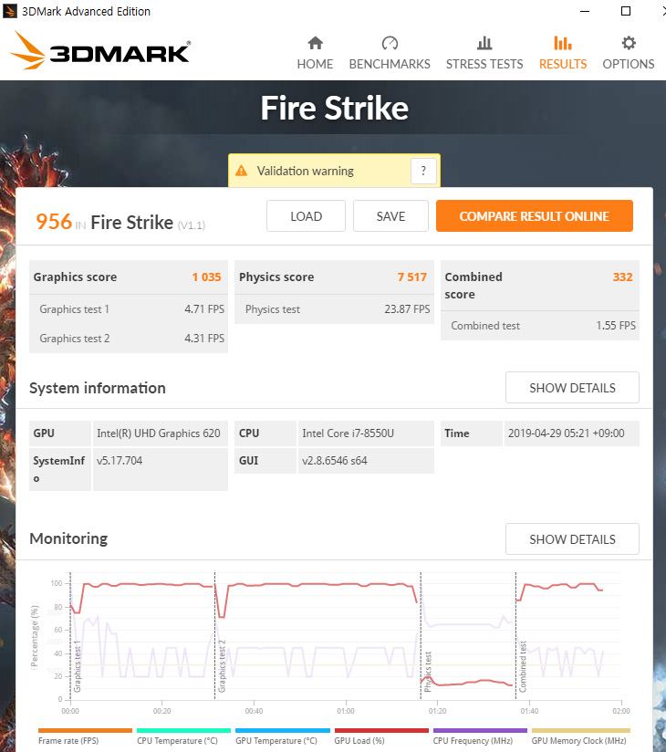 3DMARK 테스트를 해서 UHD 620 테스트를 해 봤습니다. 그래픽점수는 1035점이 나옵니다.