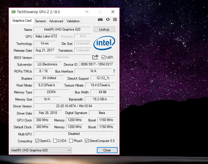 그래픽은 UHD 620이 사용이 되었습니다. 내장그래픽의 성능이 월등하게 높진 않으나 4K 재생이나 영상 작업등을 할 때 부족하진 않습니다.